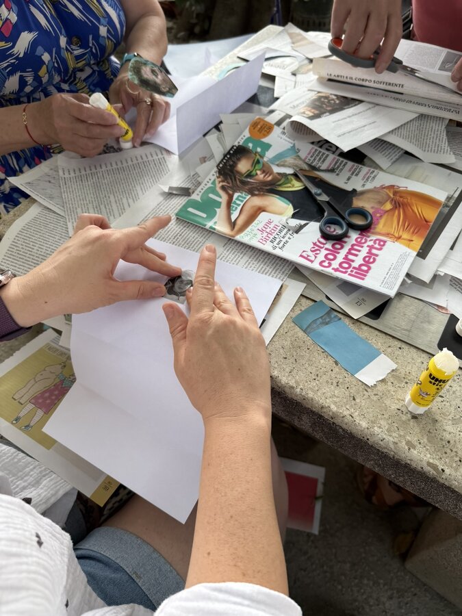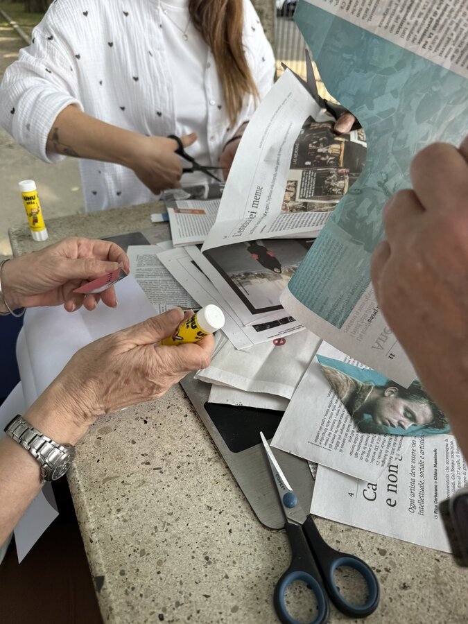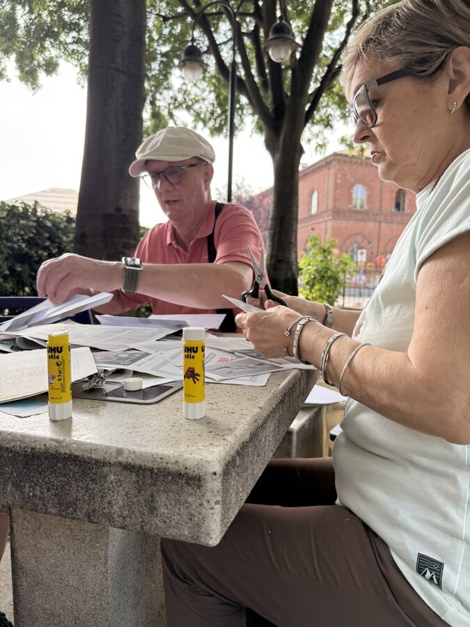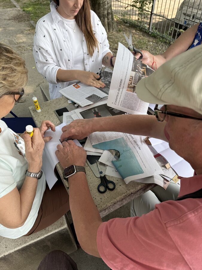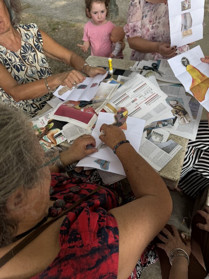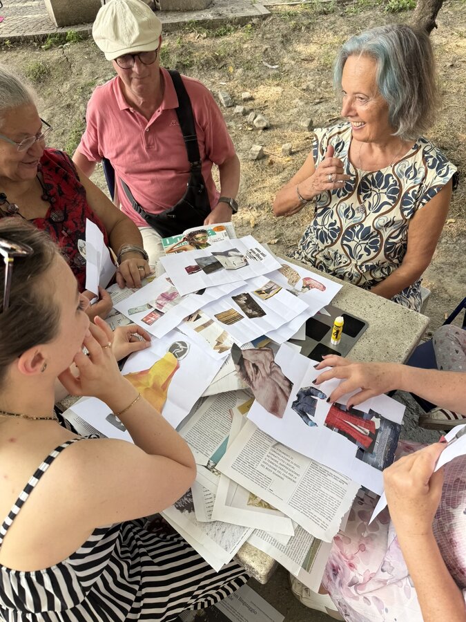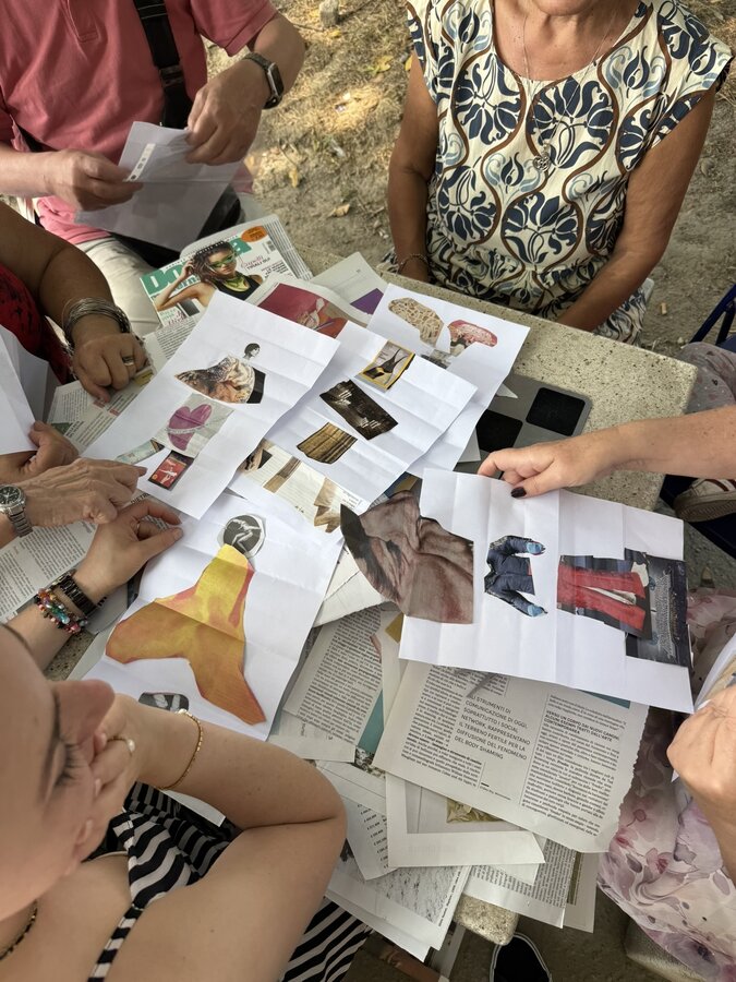 Następnie przyszedł czas na praktyczne działania - pod okiem lokalnych artystek próbowaliśmy swoich sił w szydełkowaniu i tworzeniu serwetek. Nie obyło się bez śmiechu i drobnych potknięć, ale entuzjazmu nie brakowało. Kolejnym punktem programu był warsztat surrealistycznych kolaży prowadzony przez Giancarlo - uczestnika wrocławskiego szkolenia. Efektem były pełne wyobraźni, barwne prace, które stały się kolejnym dowodem na to, że kreatywność nie zna wieku.