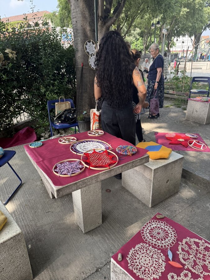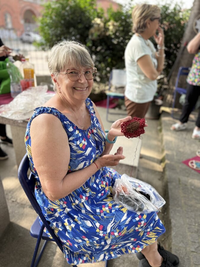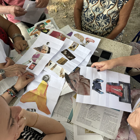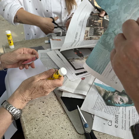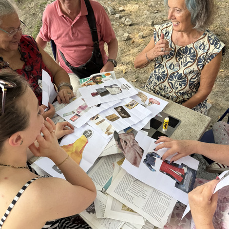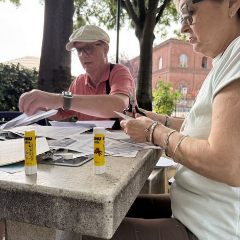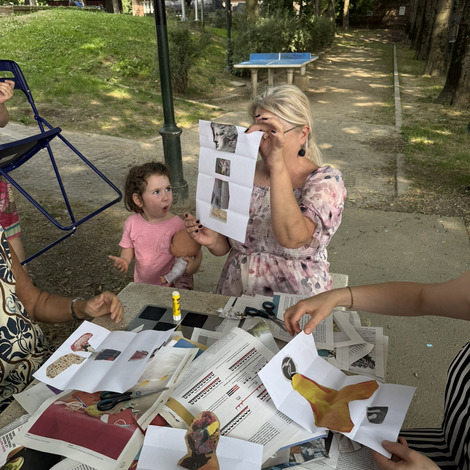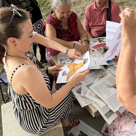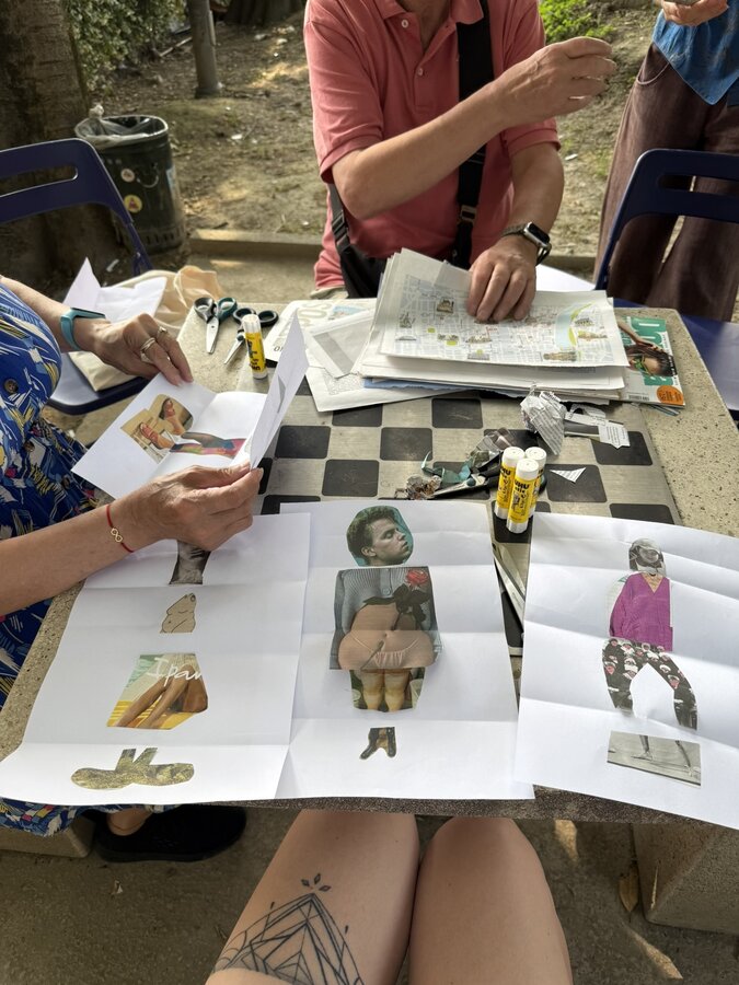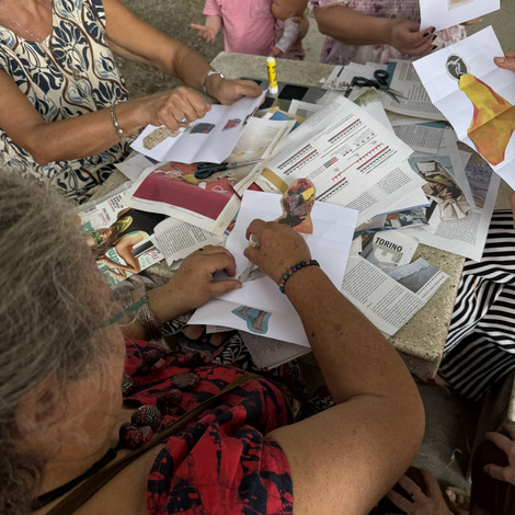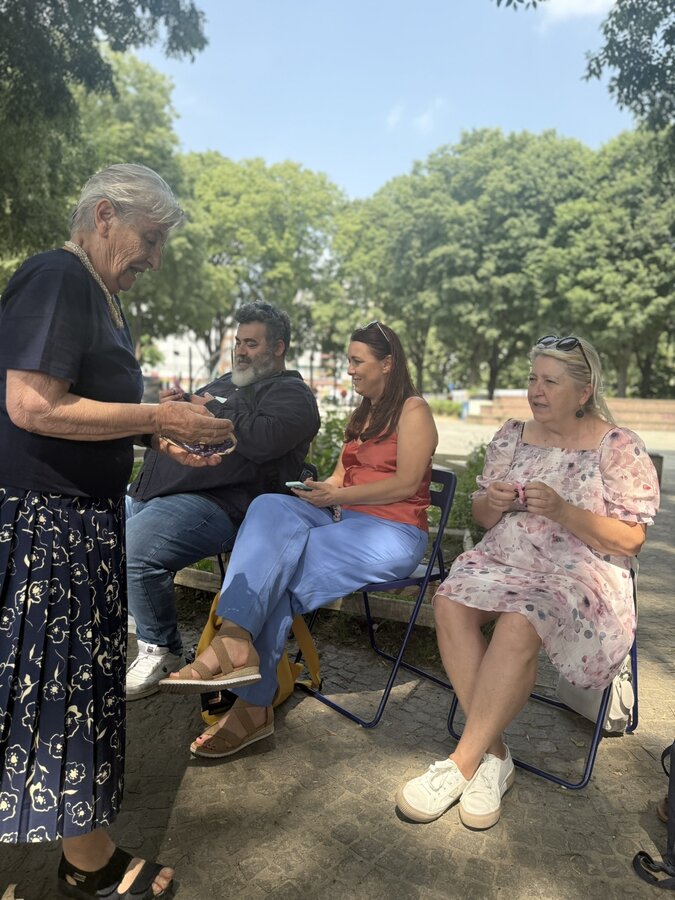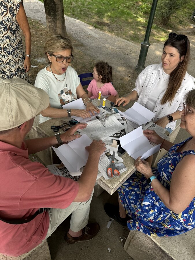 Następnie przyszedł czas na praktyczne działania - pod okiem lokalnych artystek próbowaliśmy swoich sił w szydełkowaniu i tworzeniu serwetek. Nie obyło się bez śmiechu i drobnych potknięć, ale entuzjazmu nie brakowało. Kolejnym punktem programu był warsztat surrealistycznych kolaży prowadzony przez Giancarlo - uczestnika wrocławskiego szkolenia. Efektem były pełne wyobraźni, barwne prace, które stały się kolejnym dowodem na to, że kreatywność nie zna wieku.