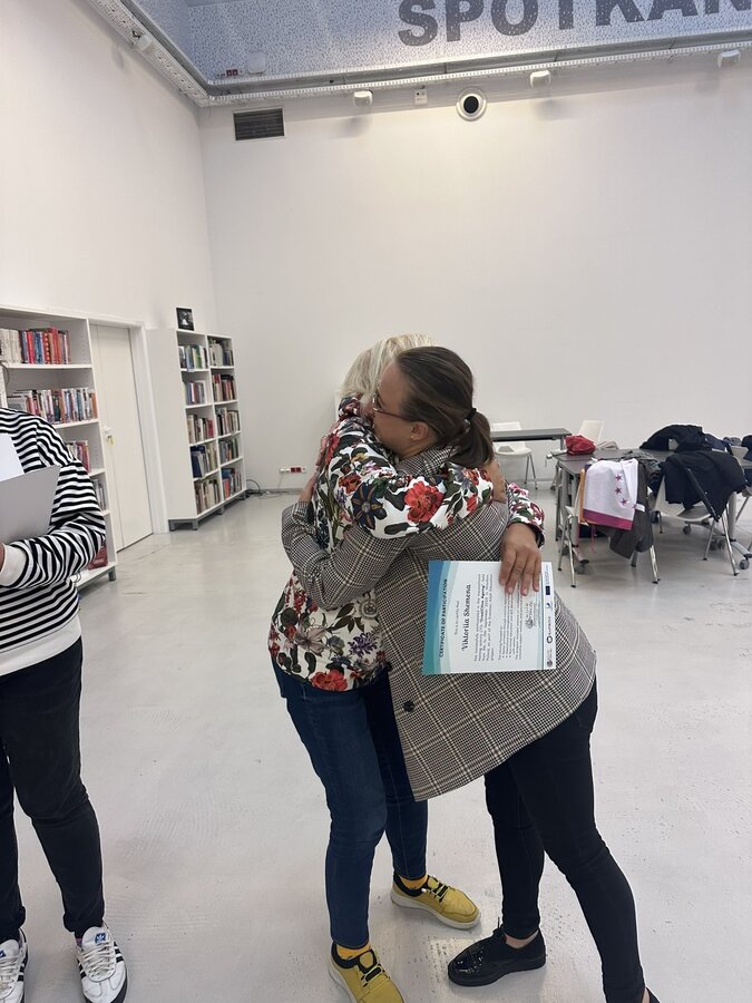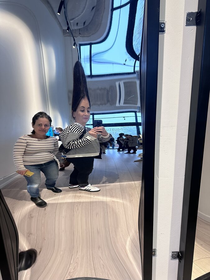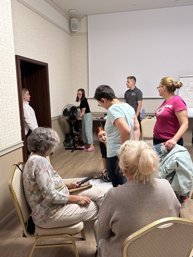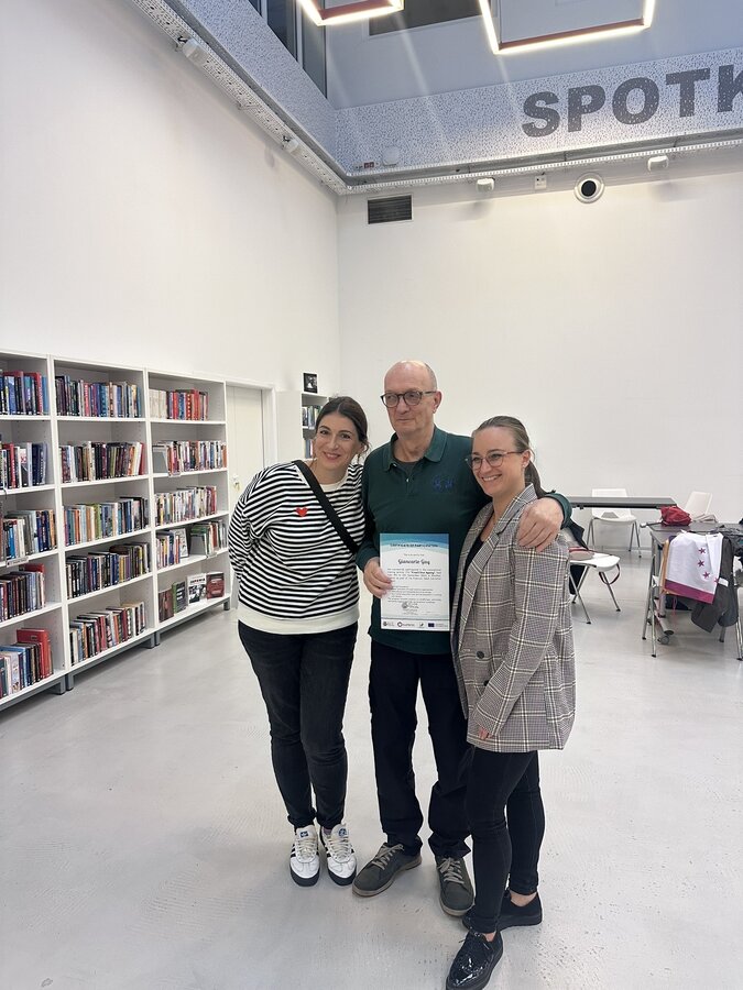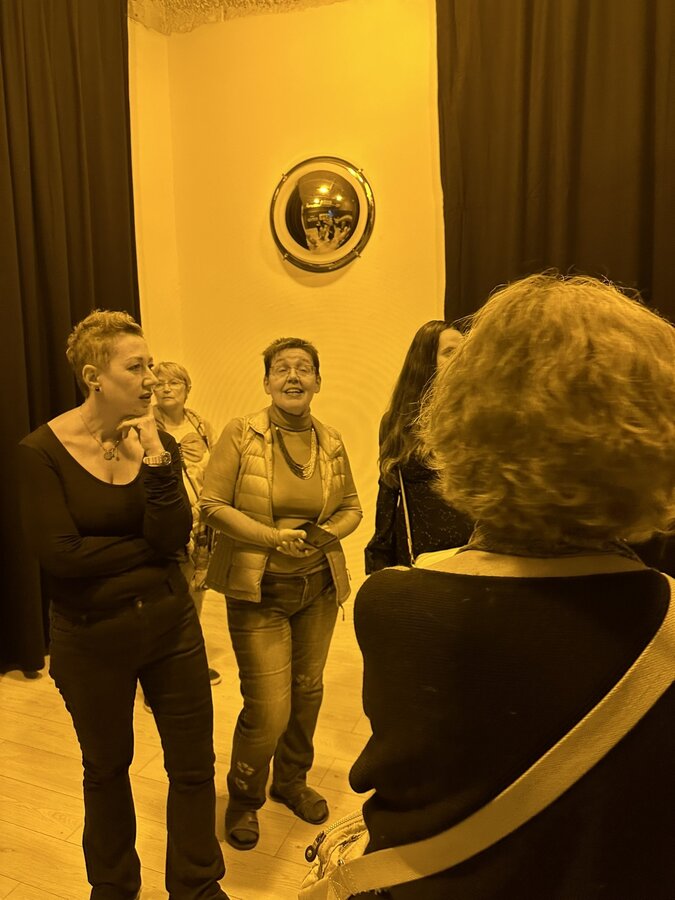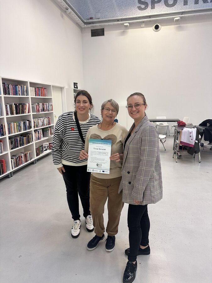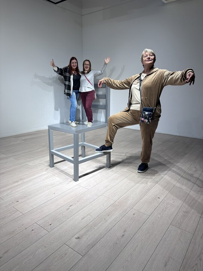 Ostatni dzień szkolenia przyniósł niespodzianki – planowane warsztaty robotyki dla seniorów musieliśmy odwołać z powodu niesprzyjającej pogody, ale szybko przystosowaliśmy się do zmienionych okoliczności. Zamiast tego odwiedziliśmy Muzeum Iluzji, które dostarczyło wielu wrażeń i zainspirowało nas do dalszych rozmów o roli percepcji w codziennym życiu. Dzień zakończył się wspólnym obiadem oraz wystawą „Portret samotności”, która poruszyła nas wszystkich. Ostatnim punktem programu było wręczenie certyfikatów, a atmosfera podziękowań i wzruszeń była niezwykle intensywna.